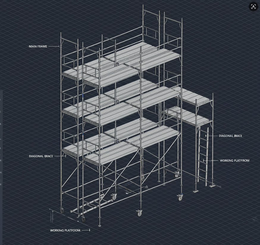 Modular Design:Interlocking components (frames, braces, platforms) allow flexible configurations for towers, mobile scaffolds, or suspended systems.